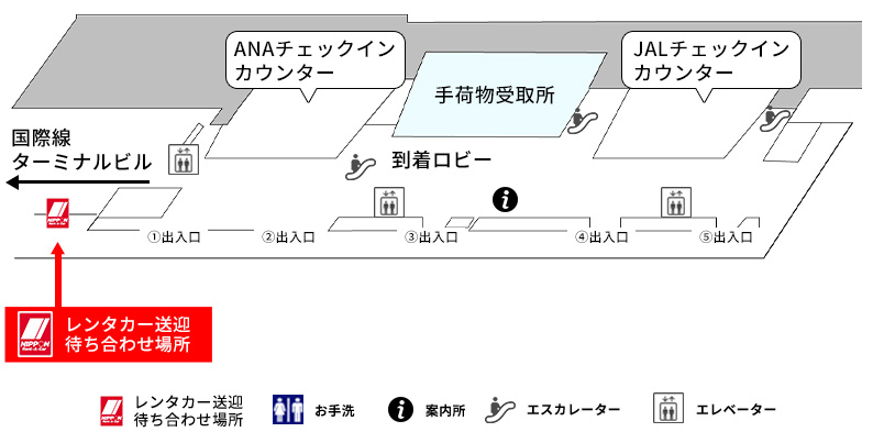 アクセス:空港ビルを出て右へ レンタカー送迎車乗降場所より送迎